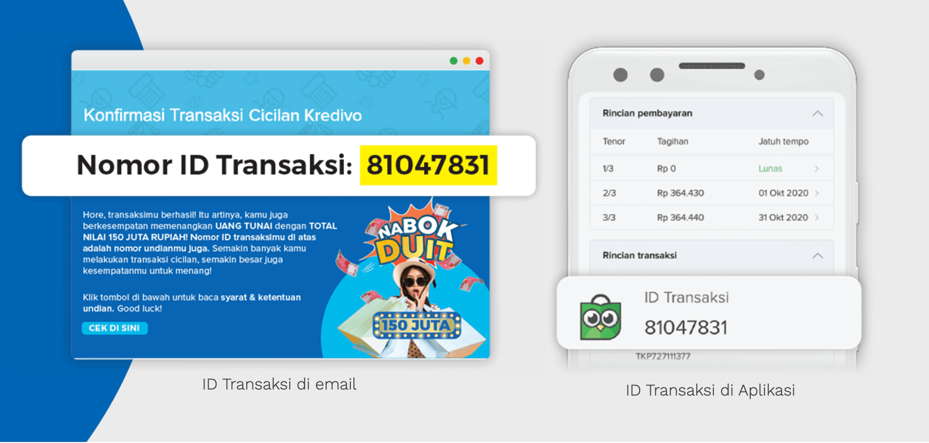 Caranya juga gampang banget, kamu cukup belanja pakai PayLater tenor 3/6/12 bulan dari Kredivo. Cek nomor ID transaksi kamu di email konfirmasi transaksi yang dikirim setelah kamu selesai belanja atau lihat di halaman “transaksi” di aplikasi, karena nomor itu adalah nomor undian kamu juga. Untuk informasi lebih jelas, simak gambar berikut: